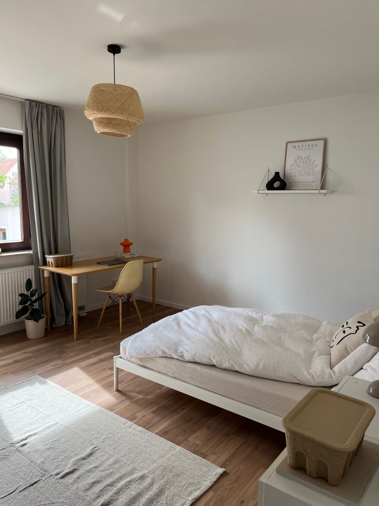Das Zimmer ist mit stilvollen Möbel eingerichtet und kann direkt bezogen werden. Darüber hinaus wird die Wohnung mit einer neuen weißen Einbauküche mit viel Stauraum vermietet. Dabei wurde sowohl ein Kühlschrank, ein Geschirrspüler, ein Herd als auch ein Induktionskochfeld mit einer leistungsstarken Dunstabzugshaube installiert. Sowohl die Umlage für die Möblierung alsauch für die Einbauküche ist in den sonstigen Nebenkosten aufgeführt.