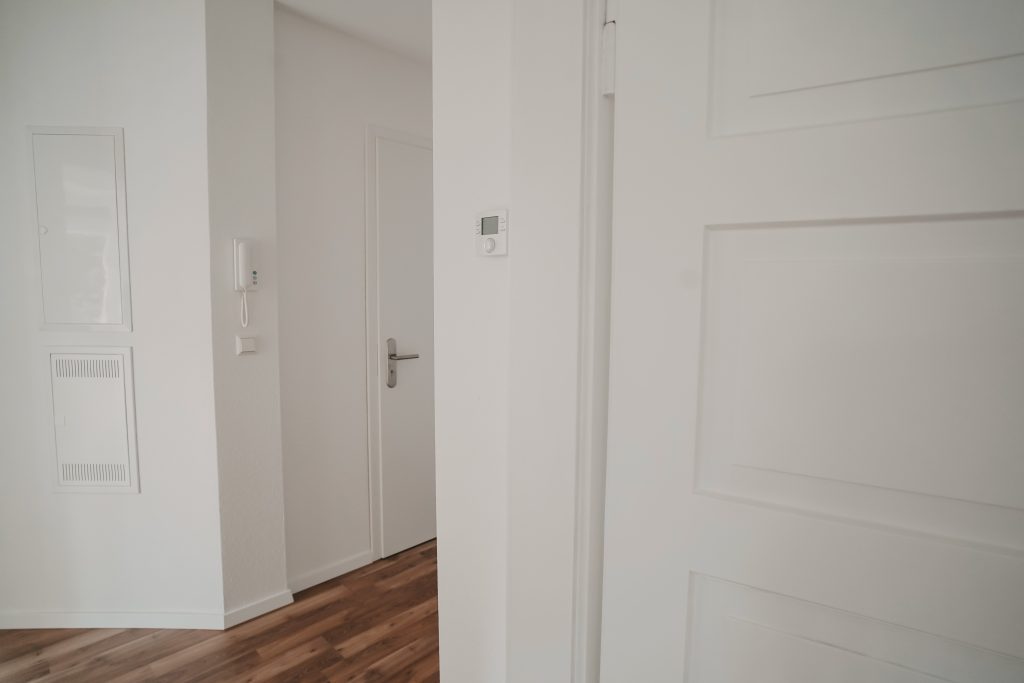 In jedem Zimmer wurden Netzwerk- und SAT-Anschlüsse installiert, die sowohl für eine TV-Wand als auch für einen Arbeitsplatz verwendet werden können. Die entsprechende Medientechnik wird im Flur in einem separaten Verteiler realisiert. Dem Home-Office in dieser Wohnung steht nichts entgegen.