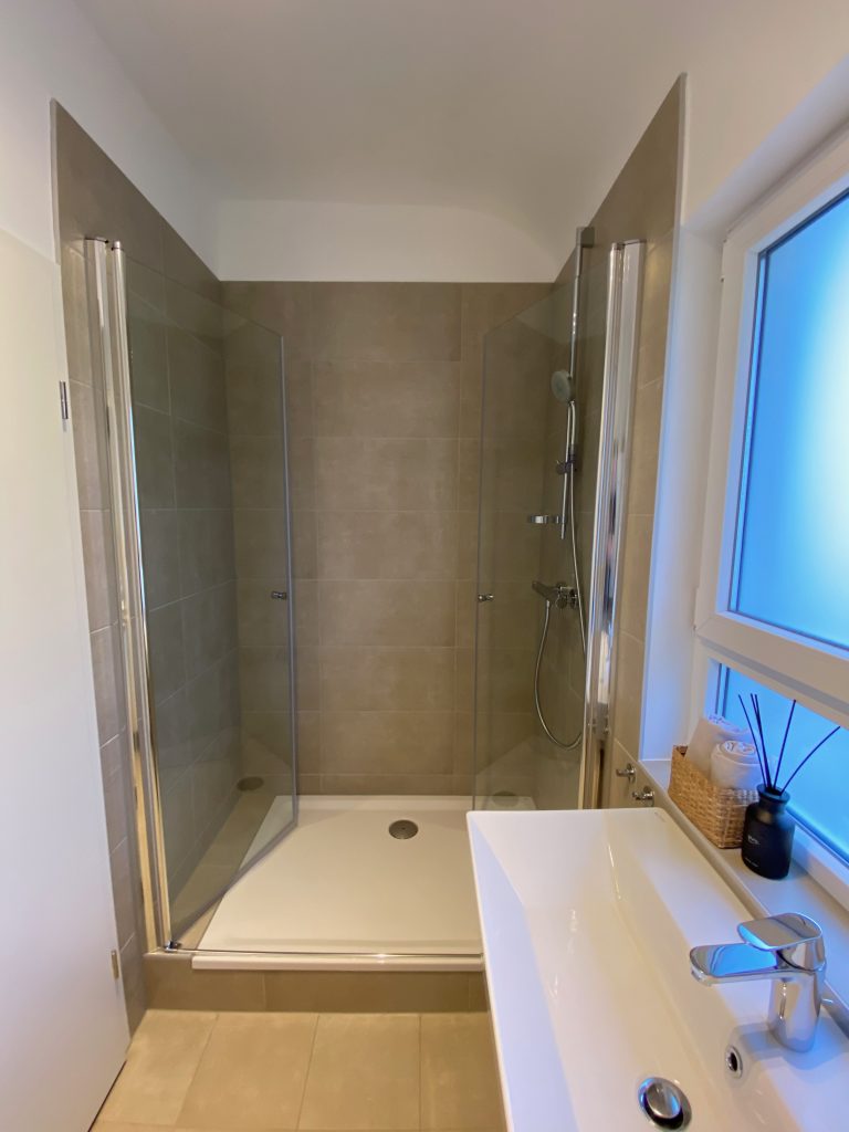 Die Altbauwohnung besitzt ein lichtdurchflutetes Tageslicht-Badezimmer mit Keramikfliesen in Betonoptik. Das Badezimmer ist mit hochwertigem Doppelwaschbecken und großzügiger Dusche ausgestattet. Neben dem Badezimmer gibt es ein separates WC.